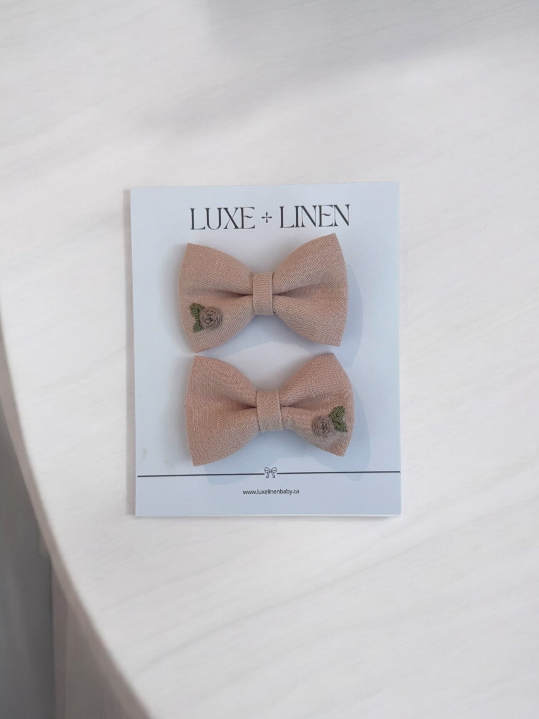 This 2 pack of handmade linen bow clips is the perfect finishing touch for your little girls everyday wardrobe. Crafted from premium 100% linen fabric, each bow has been thoughtfully made and includes a beautiful hand embroidered floral detail.