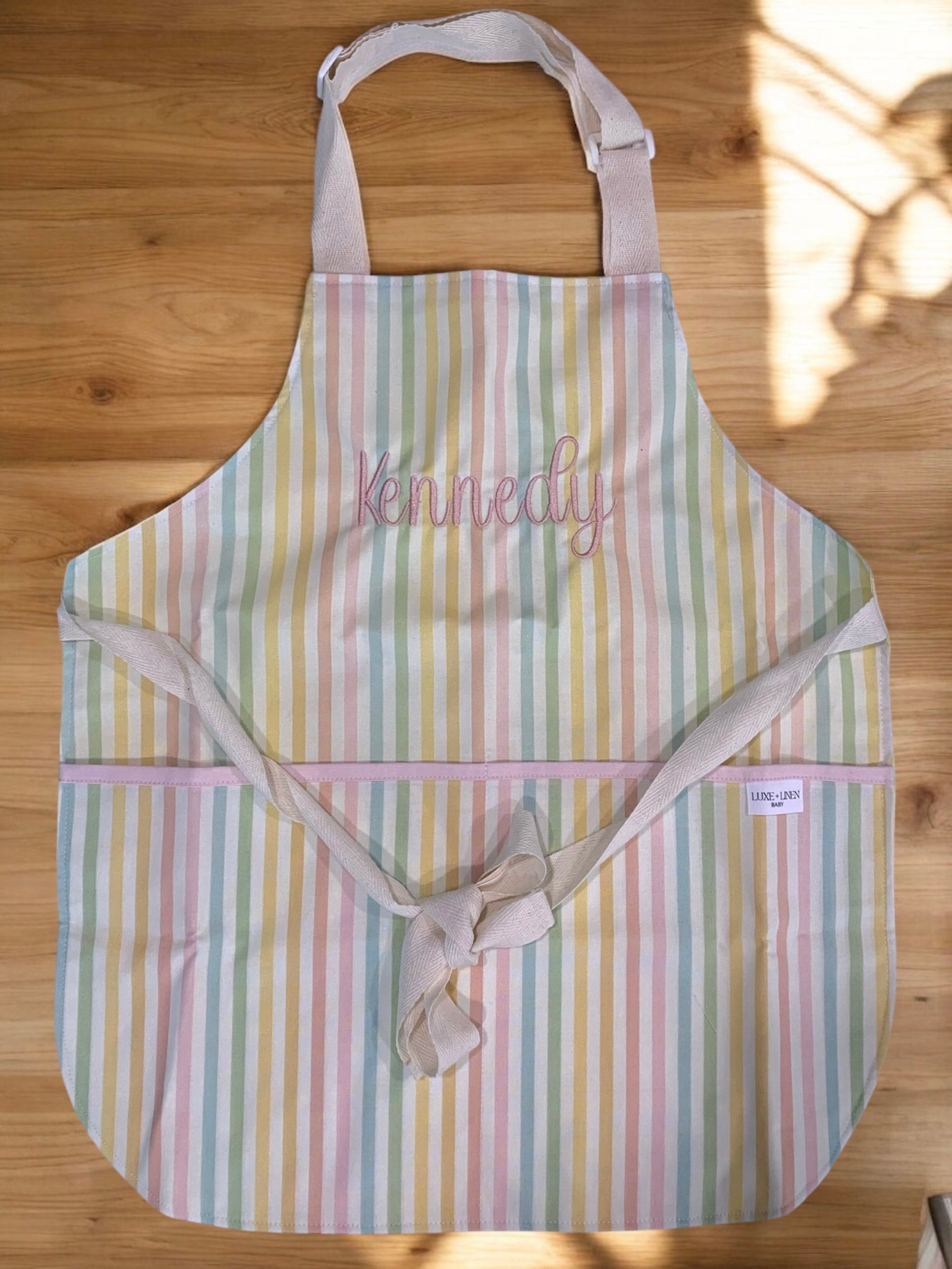 handmade from 100% cotton and double lined for extra durability ā with an adjustable neck strap to grow with your little one and two front pockets for all their treasures.